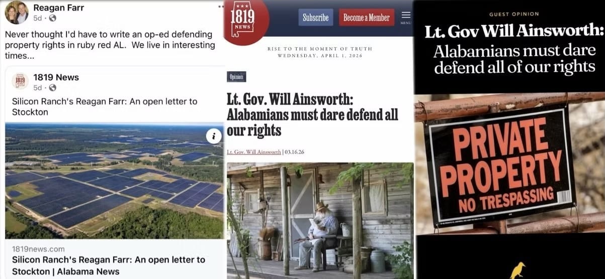 The most recent disagreement stems from an op-ed that he wrote for 1819News on March 16, 2026, entitled, “Lt. Gov. Will Ainsworth: Alabamians must dare defend all our rights.” The title makes it sound like a pro-freedom, red state Republican warning to guard and defend our rights. However, midway through his slick talk about freedom and protecting property rights, he starts defending a massive $800 million solar farm project in south Alabama that Alabamians have been fighting tooth and nail. That’s when my blood began to boil! I immediately saw through his clever manipulation. He pulls on the heart strings of freedom-loving Alabamians and then pushes us to accept the well-hidden plan of the coming technological tyranny.