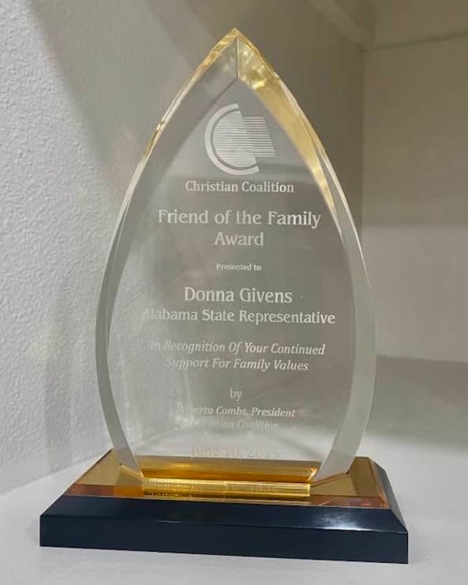 Alabama State Representative Donna Givens (R-Loxley) has been honored with the Friend of the Family Award by the Christian Coalition of Alabama, recognizing her unwavering commitment to protecting the lives of newborns and supporting families in crisis through her advocacy of the Baby Box Bill.