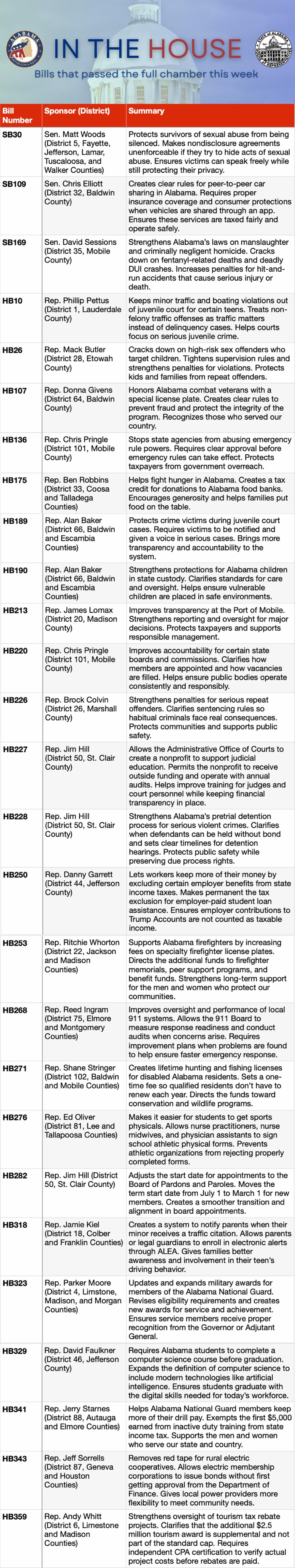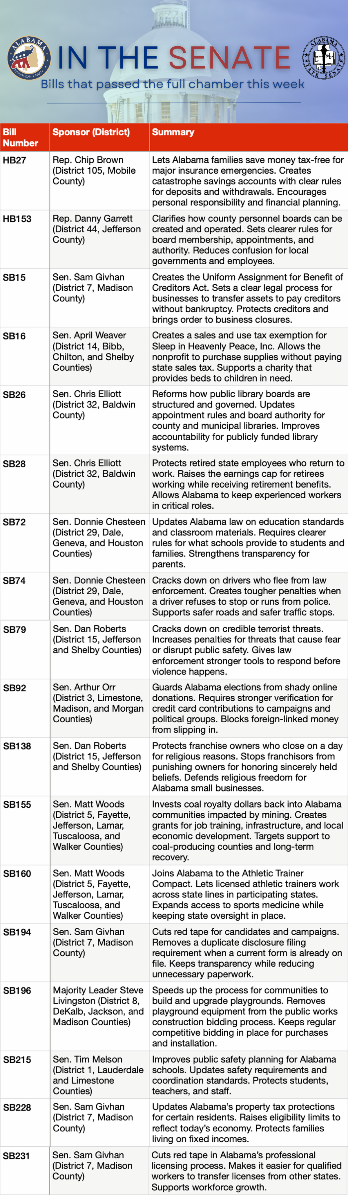 HB27 — Sponsored by Representative Chip Brown and carried in the Senate by Senator Sam Givhan, this legislation creates catastrophe savings accounts so Alabama families can set aside money tax-free for major insurance emergencies.