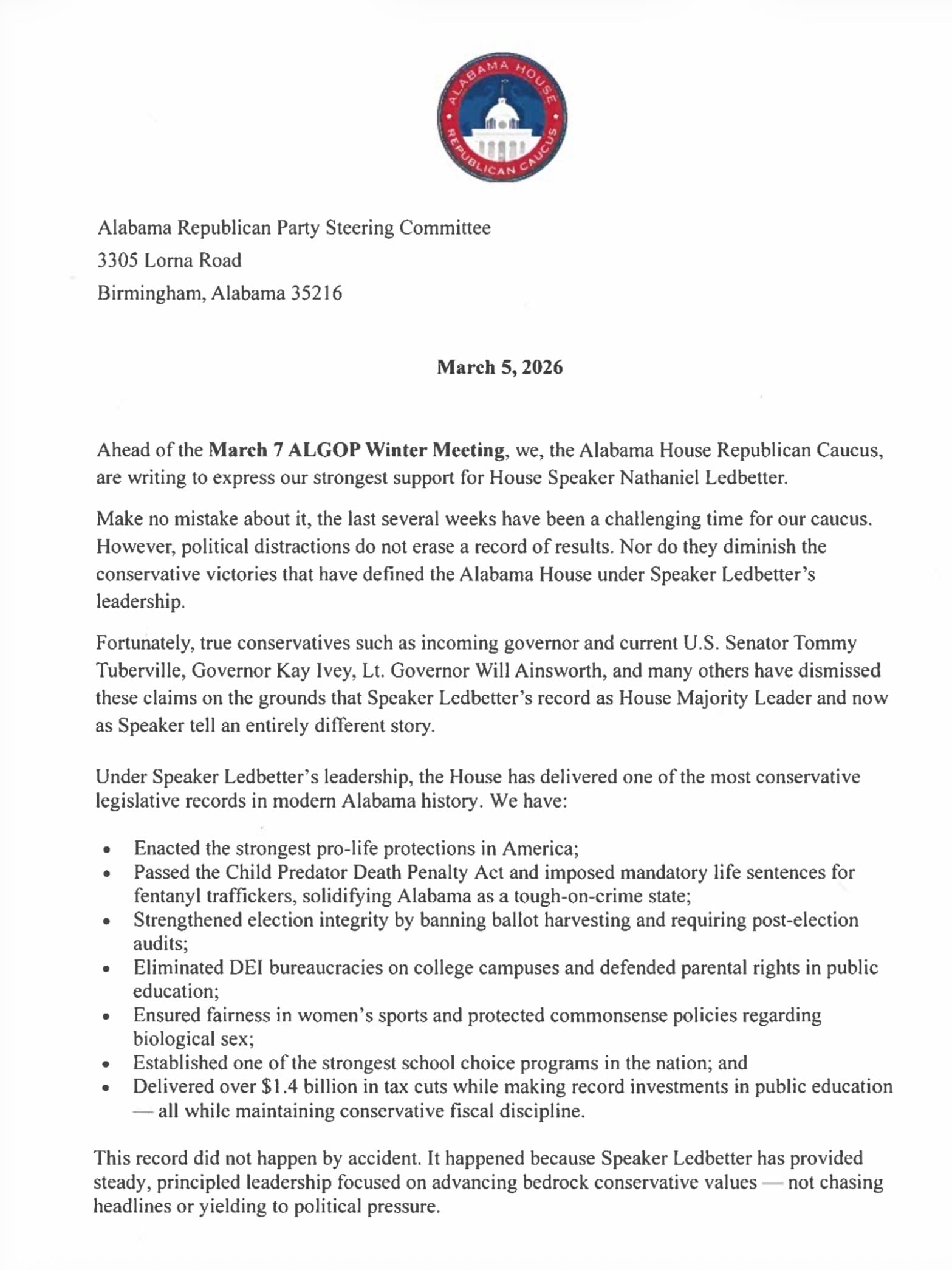 Ahead of the March 7 ALGOP Winter Meeting, we, the Alabama House Republican Caucus, are writing to express our strongest support for House Speaker Nathaniel Ledbetter.