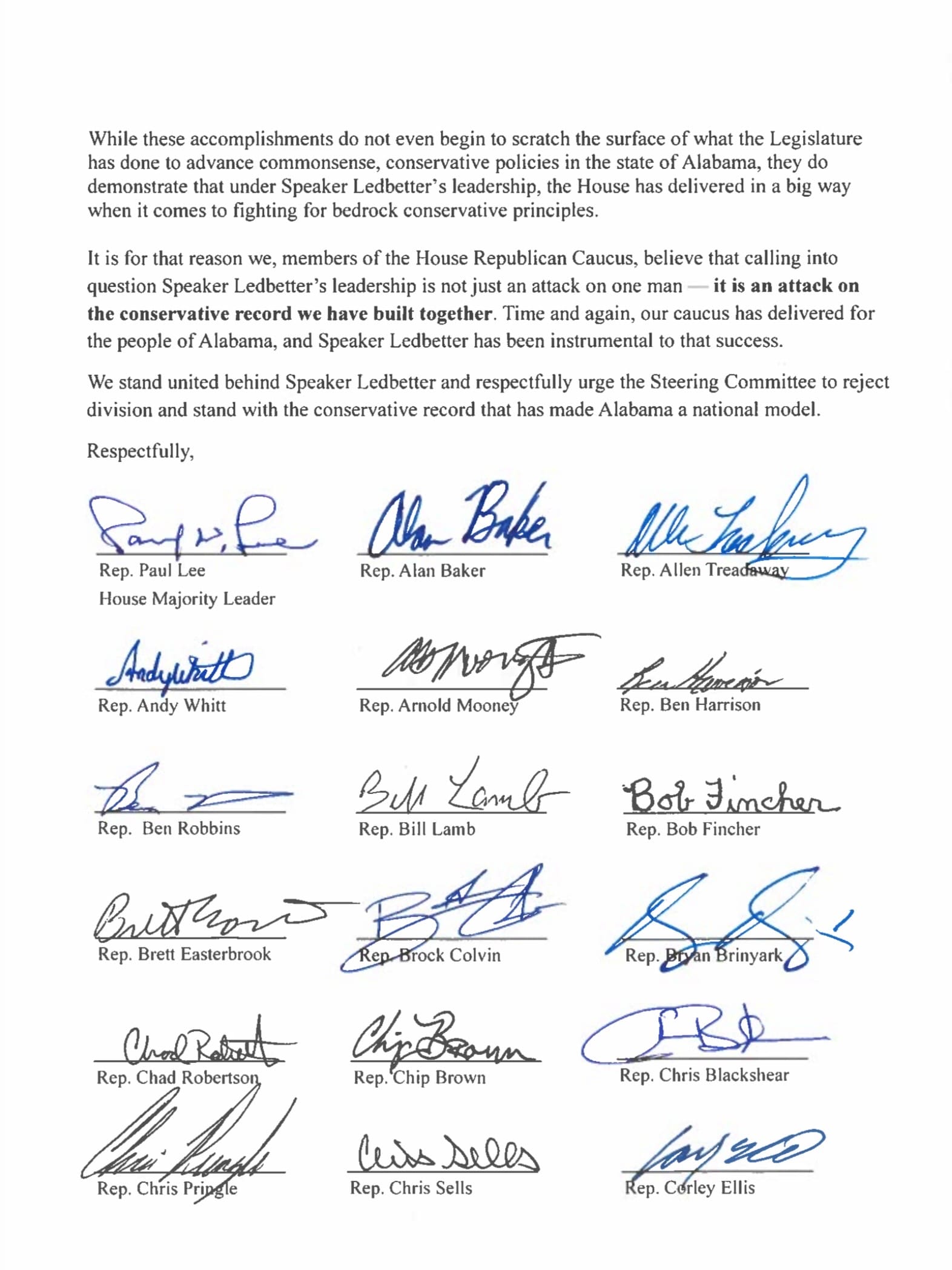 It is for that reason we, members of the House Republican Caucus, believe that calling into question Speaker Ledbetter’s leadership is not just an attack on one man — it is an attack on the conservative record we have built together. Time and again, our caucus has delivered for the people of Alabama, and Speaker Ledbetter has been instrumental to that success.