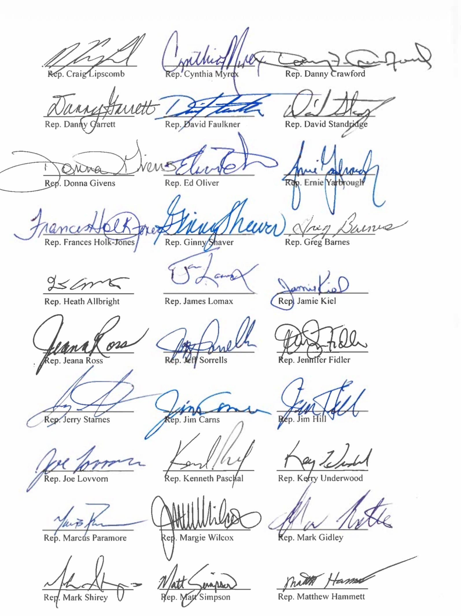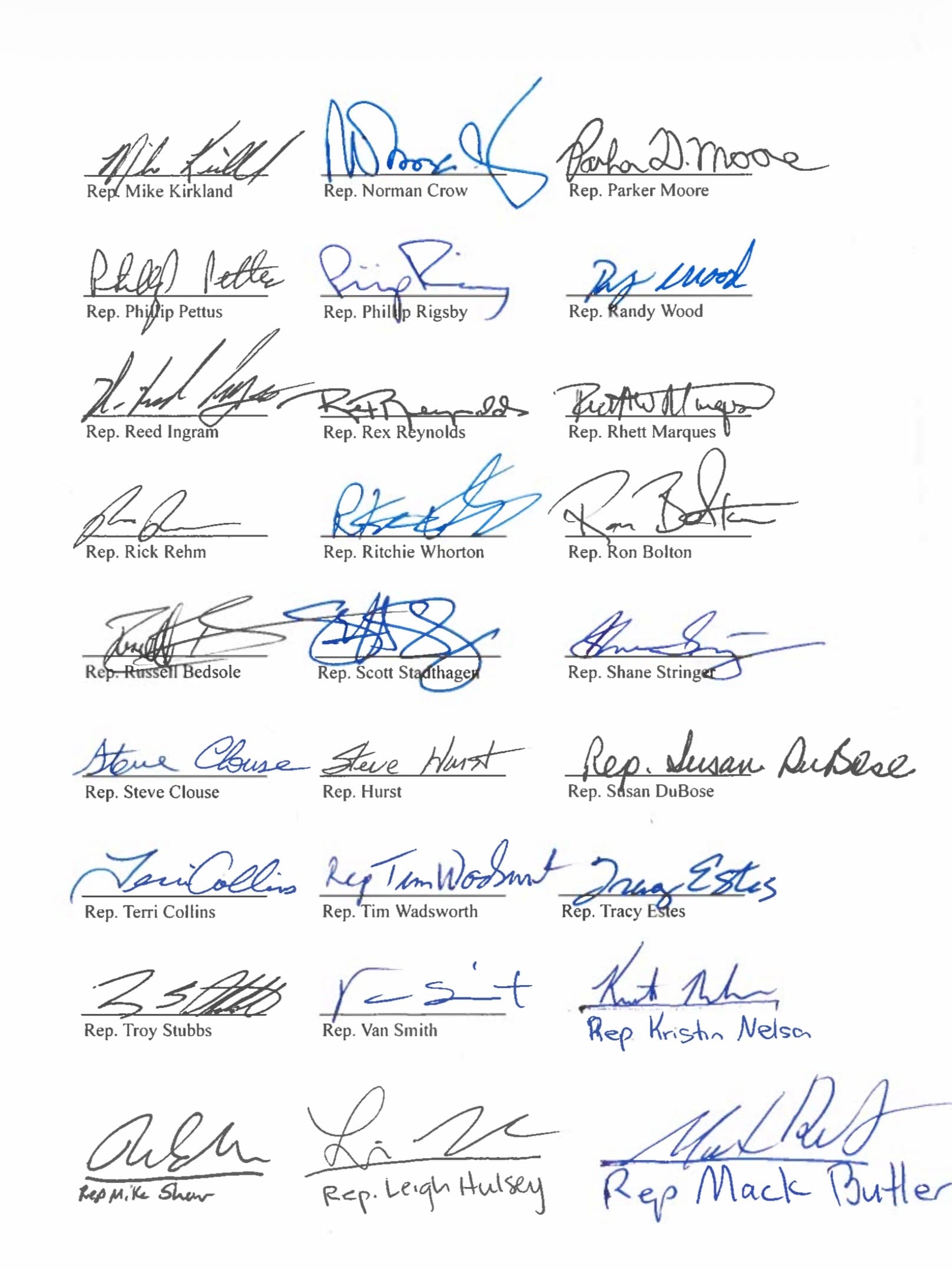 The letter, which is attached in PDF format and copied below, is signed by all 75 members of the House GOP Caucus and details the conservative bills, measures, and initiatives that have been passed under the leadership of Speaker of the House Nathaniel Ledbetter (R - Rainsville).