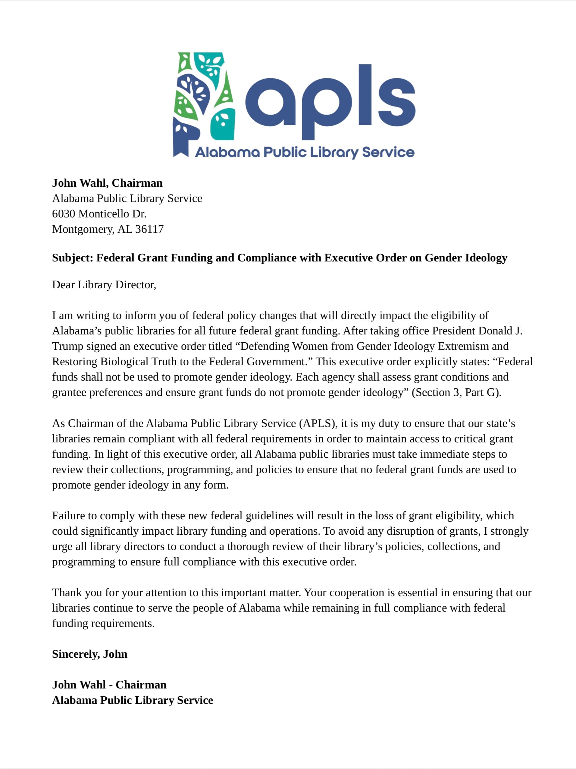 Wahl’s letter urges Alabama libraries to take immediate steps ahead of the new fiscal year. He added:
