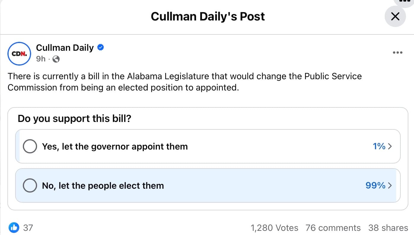 A social media poll by Cullman Daily News had surveyed 1,280 Alabamians at the time of this writing, and found that 99 percent opposed eliminating elections for the PSC and wanted to keep the positions elected. To see or vote in this active poll, go here.