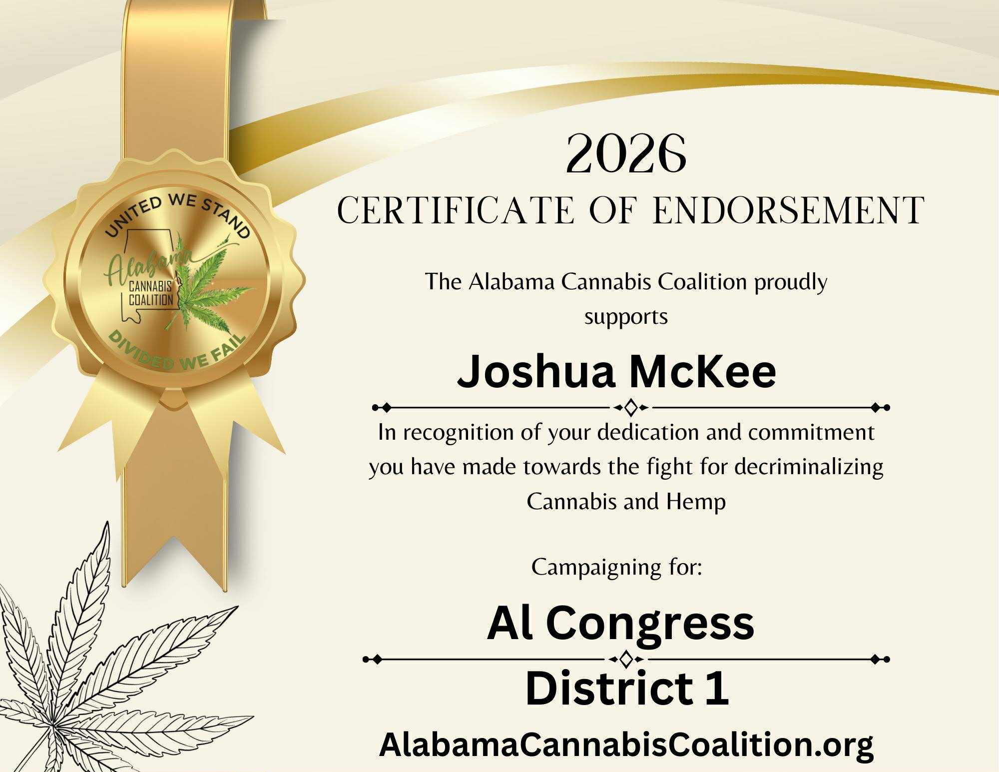 The Alabama Cannabis Coalition and the Alabama Republicans Against Marijuana Prohibition are proud and very excited to publicly announce our endorsement of Joshua McKee, candidate for US Congress, District 1 for the 2026 Midterm Elections. We believe he is exactly who we need to send to Washington DC to stand up for the freedom and liberty of Alabamians and all citizens in the nation to end the insanity of the ongoing Prohibition of Cannabis. Joshua McKee has a very impressive background and we encourage you to visit his social media platforms and his website to learn more.