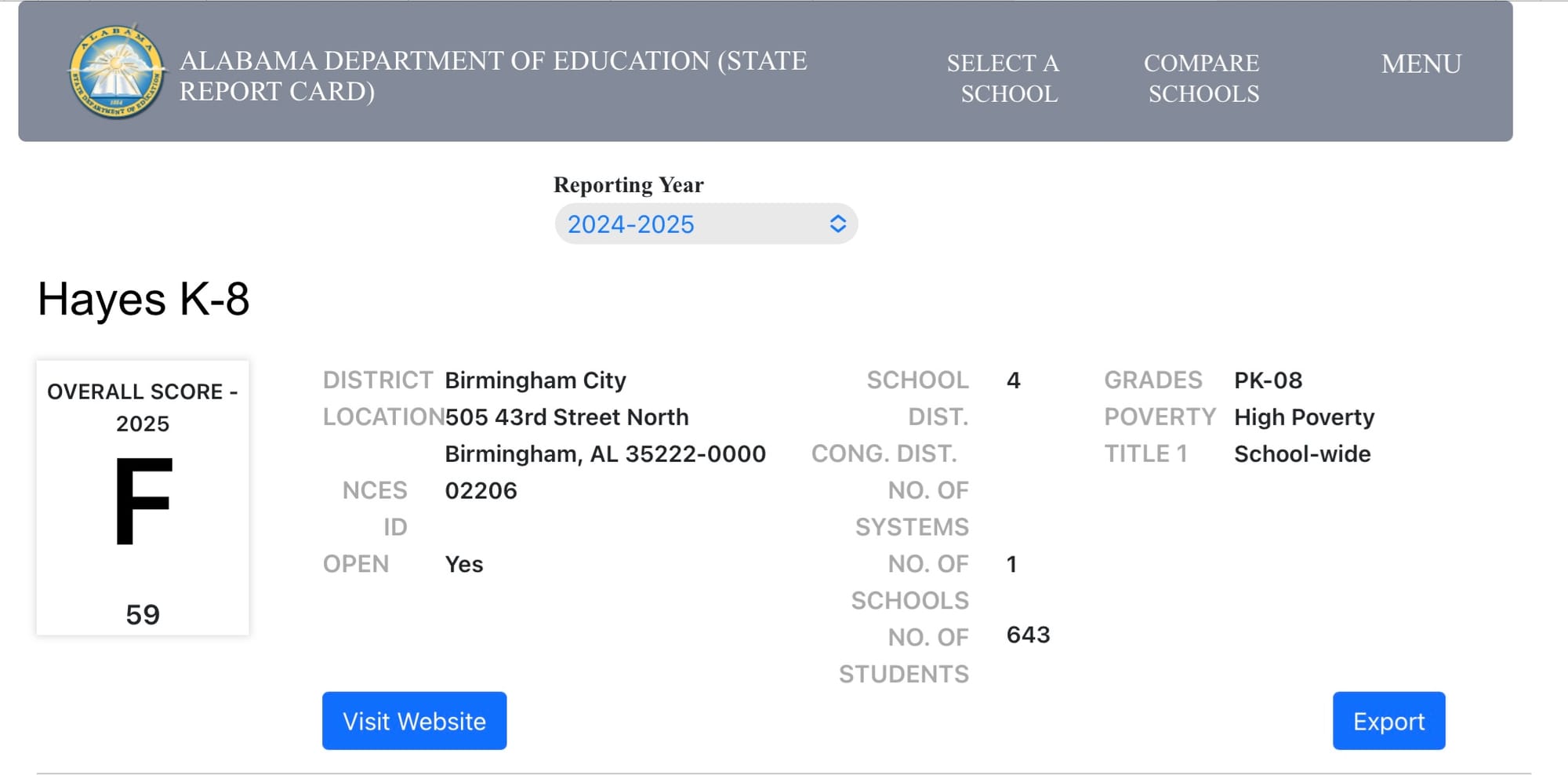 The single failing school in Birmingham was not mentioned in any public comment or release of materials, but according to the report card it is Hayes K-8.