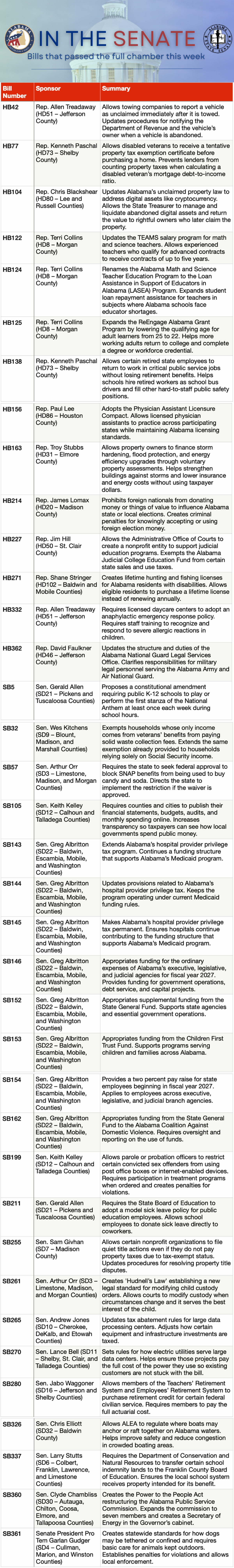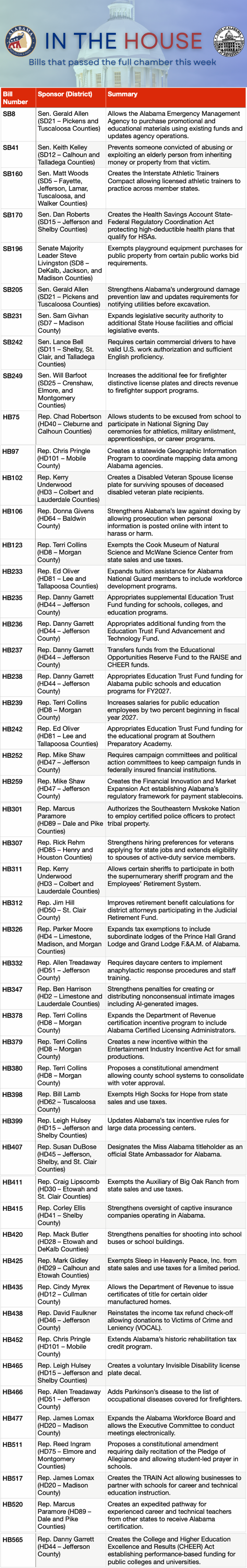 Additionally, a number of strong bills advanced to Governor Kay Ivey’s desk for her signature over the past two weeks, including: