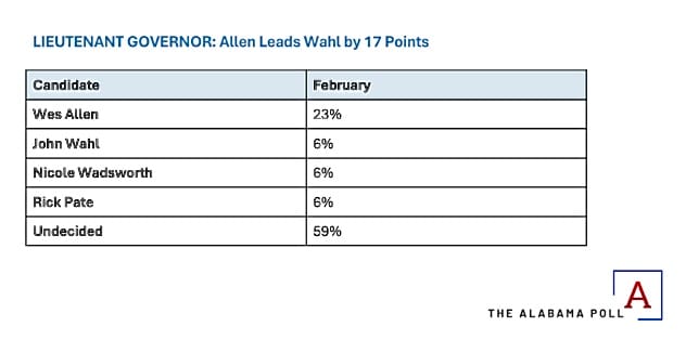 New polling data from The Alabama Poll shows that Secretary of State Wes Allen has a commanding lead over former ALGOP Chairman John Wahl in the race to become Alabama’s next Lieutenant Governor.