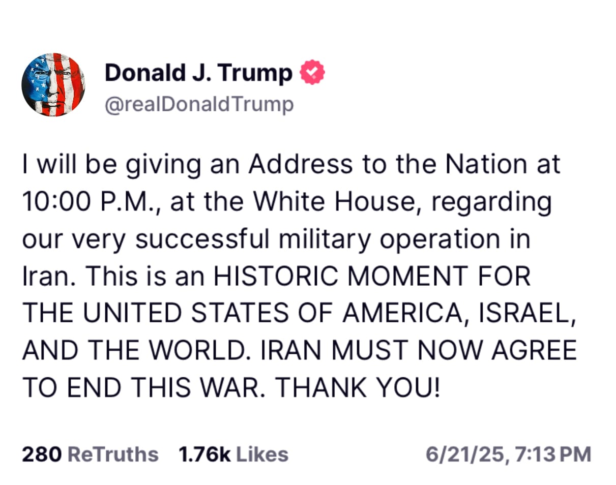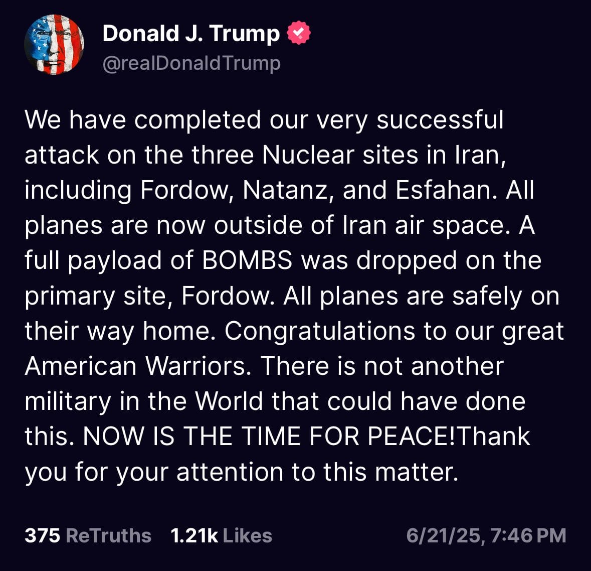 “We have completed our very successful attack on the three Nuclear sites in Iran, including Fordow, Natanz, and Esfahan. All planes are now outside of Iran air space. A full payload of BOMBS was dropped on the primary site, Fordow. All planes are safely on their way home. Congratulations to our great American Warriors. There is not another military in the World that could have done this. NOW IS THE TIME FOR PEACE! Thank you for your attention to this matter.”