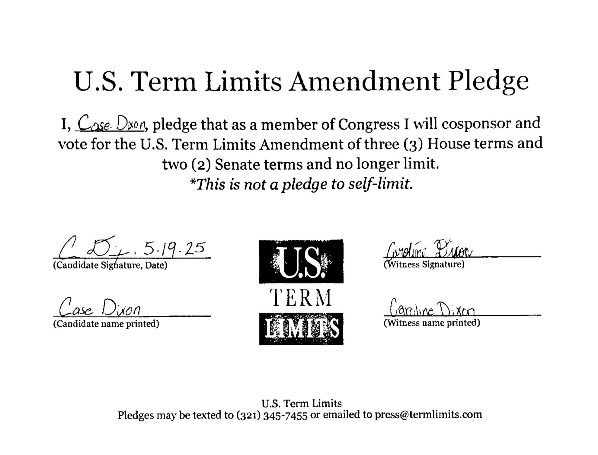 The U.S. Term Limits Amendment pledge commits Dixon to cosponsor and vote for legislation limiting House members to three terms and Senators to two. While the pledge is not a requirement to self-limit, Dixon went further, personally vowing to serve no more than four terms, or eight years, in the House if elected."