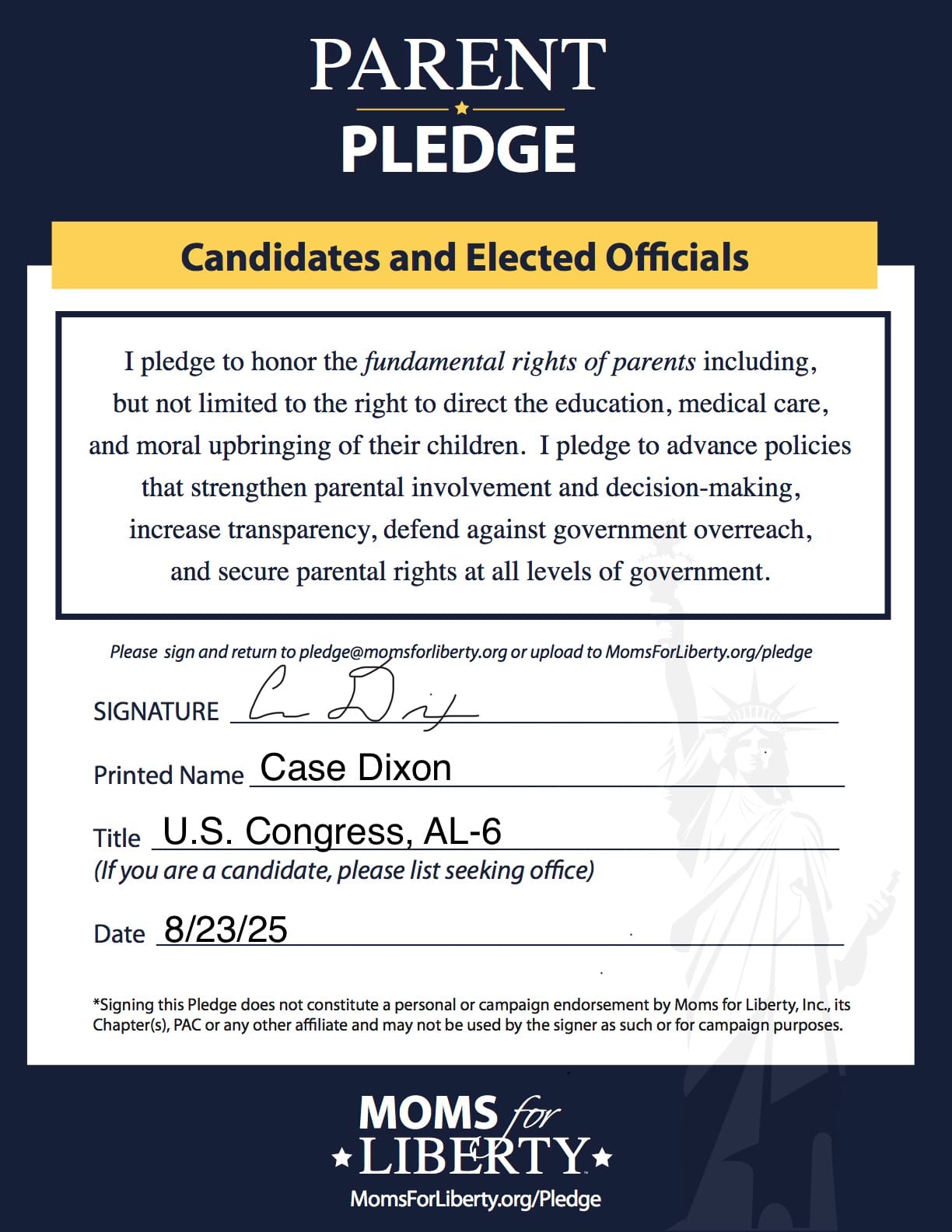 The Moms for Liberty pledge affirms Dixon's promise to honor the fundamental rights of parents—including the right to direct the education, medical care, and moral upbringing of their children. Dixon noted that his conviction on this issue is rooted in personal experience.