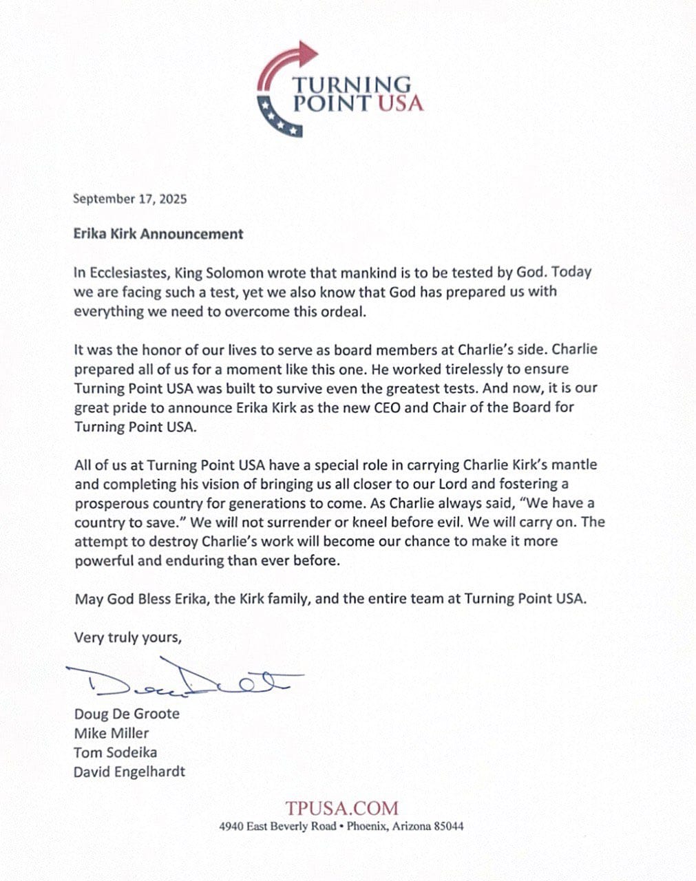 “It was the honor of our lives to serve as board members at Charlie's side. Charlie prepared all of us for a moment like this one. He worked tirelessly to ensure Turning Point USA was built to survive even the greatest tests. And now, it is our great pride to announce Erika Kirk as the new CEO and Chair of the Board for Turning Point USA.”