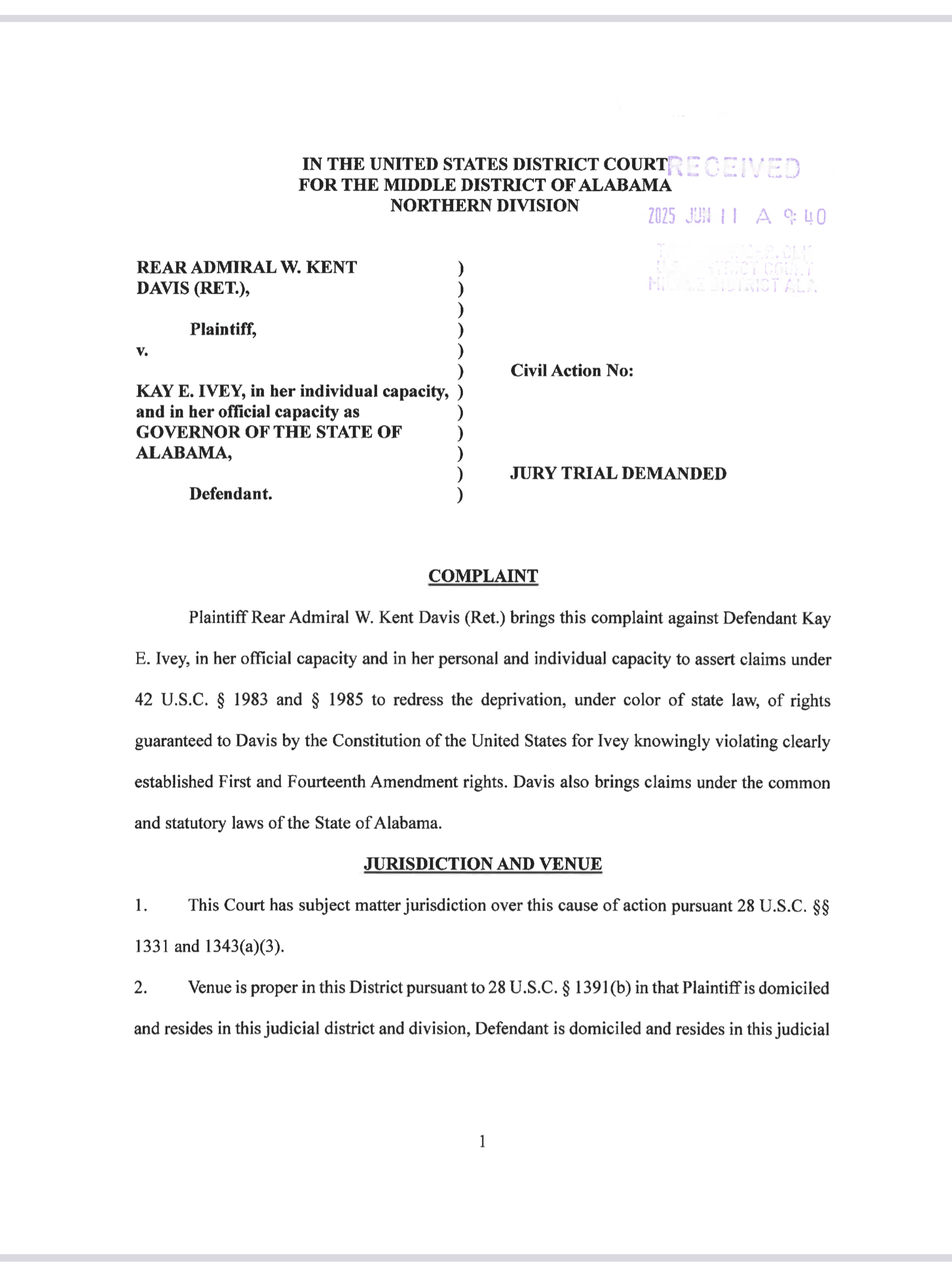 Rear Admiral W. Kent Davis (Ret.), former Commissioner of the Alabama Department of Veterans Affairs (ADVA), has filed a lawsuit against Alabama Governor Kay Ivey, both in her official and individual capacities. In the filing, Davis alleges that his removal was unlawful, retaliatory, and violated his constitutional and statutory rights. The complaint includes claims of First and Fourteenth Amendment violations, wrongful termination, defamation, and more.