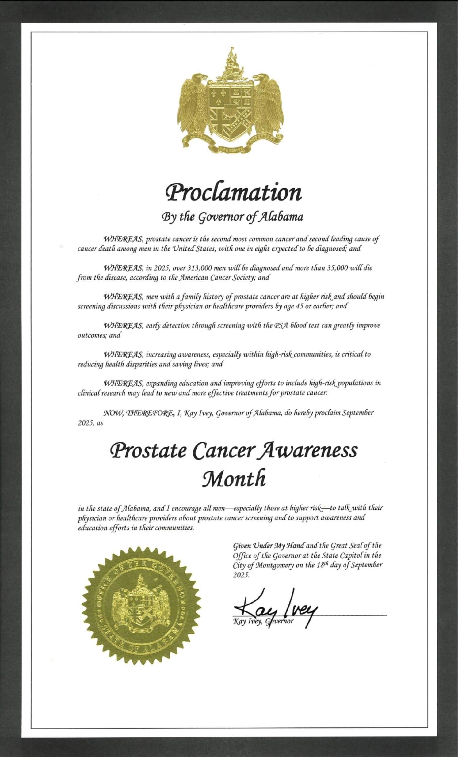 Governor Ivey’s proclamation serves as a statewide call to action, urging men to schedule regular prostate cancer screenings. The document also highlights the heightened risks faced by African American men, who tend to be diagnosed more often and have poorer outcomes.