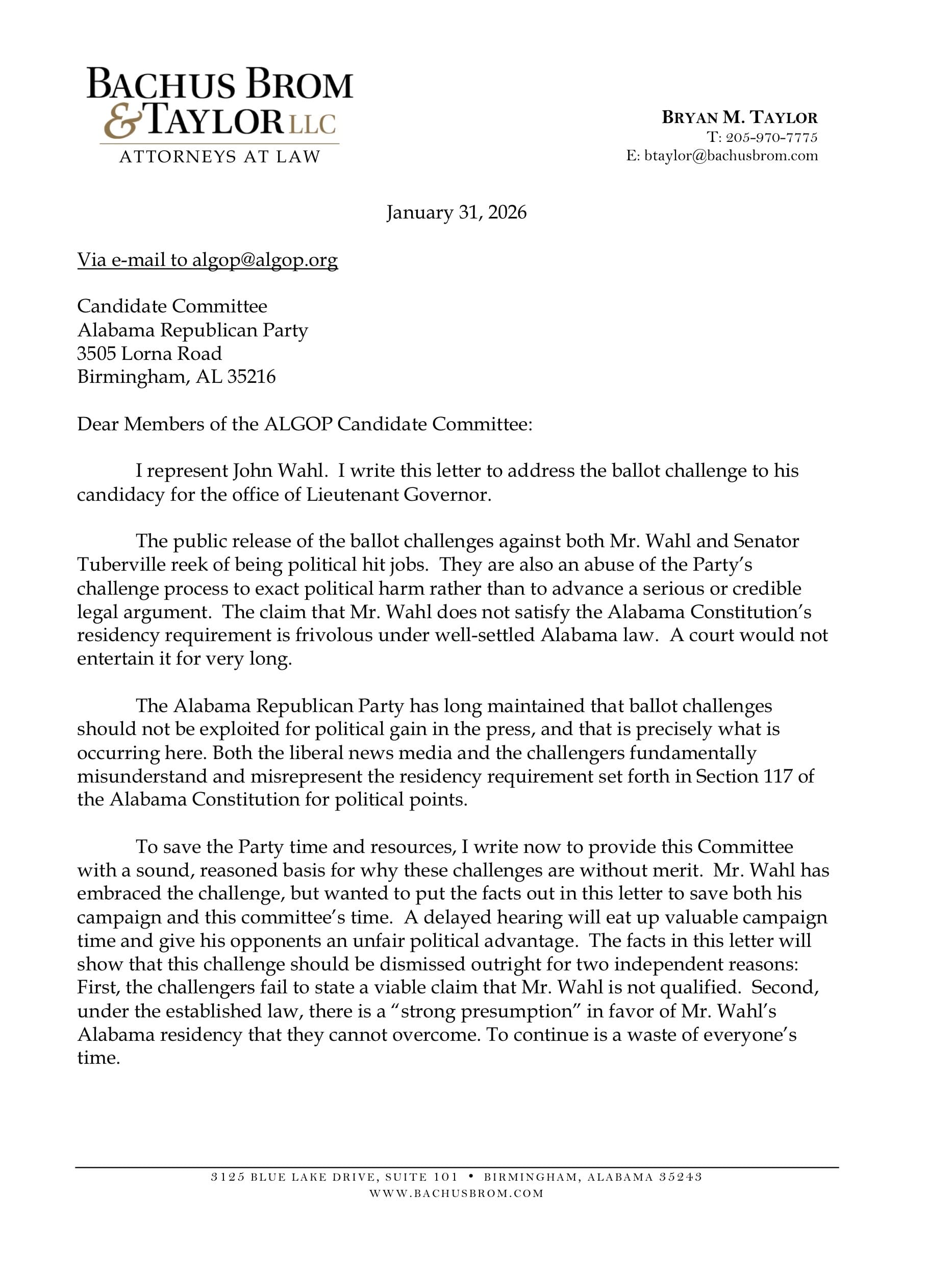 The Alabama Republican Party’s Candidate Committee has dismissed a ballot challenge questioning John Wahl’s eligibility to run for Lieutenant Governor in the Republican primary, affirming that he meets the state’s constitutional requirements. The complaint had centered on Wahl’s residency history, including a second residence in Tennessee within the past seven years.