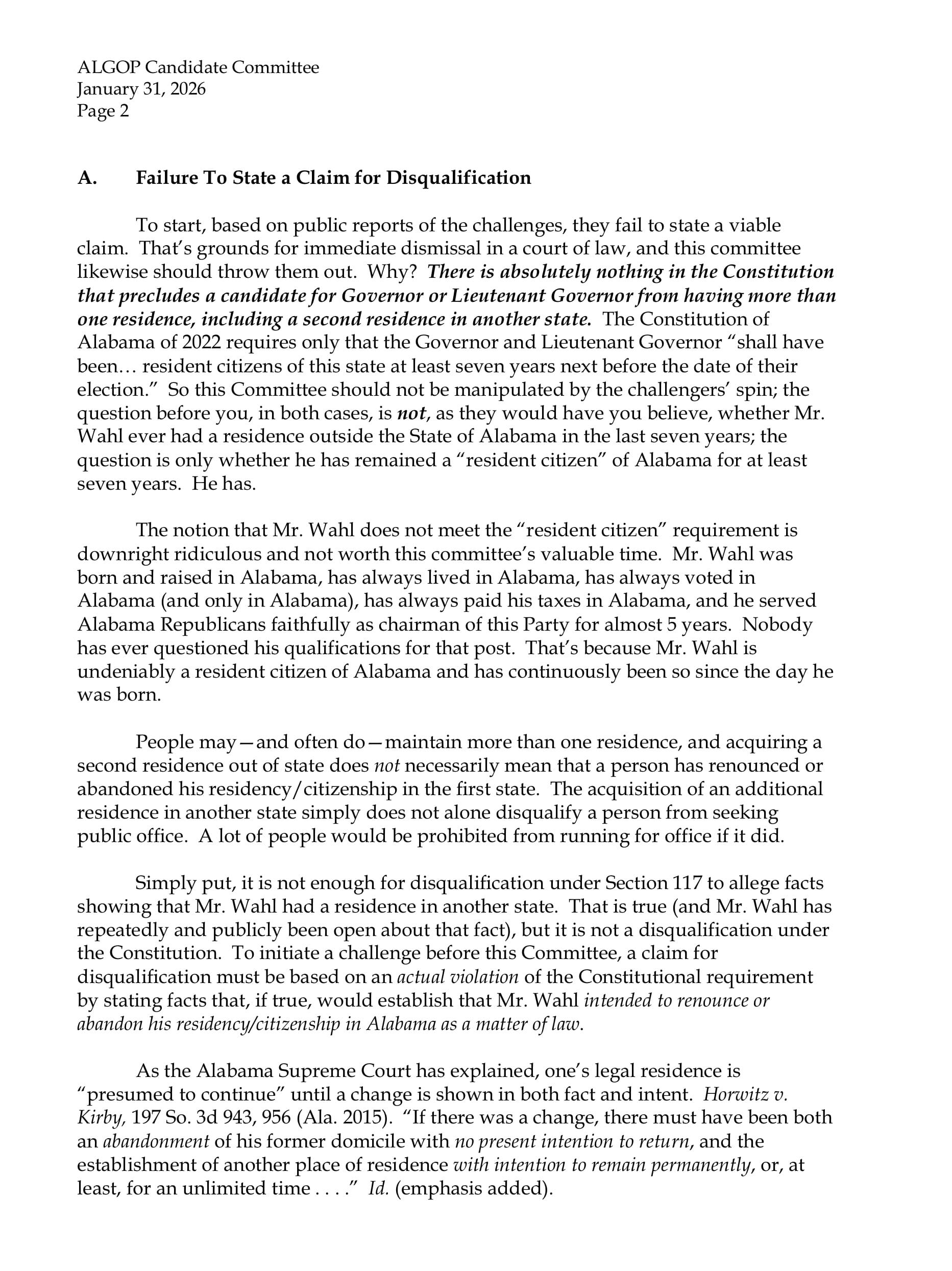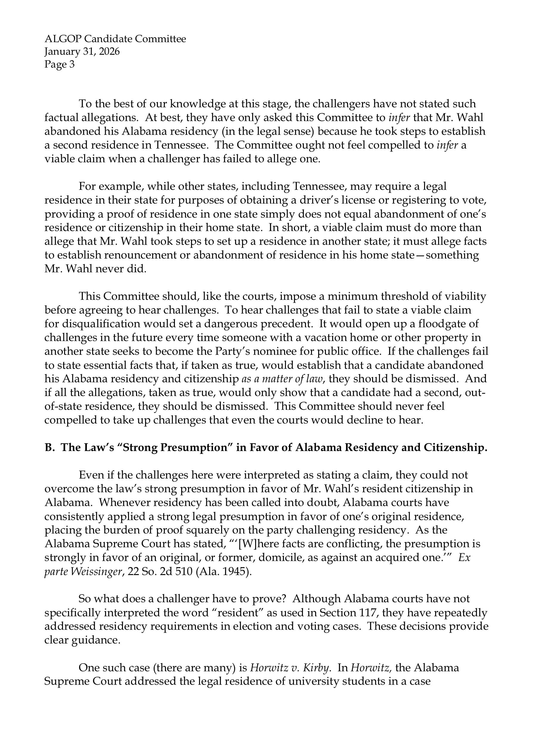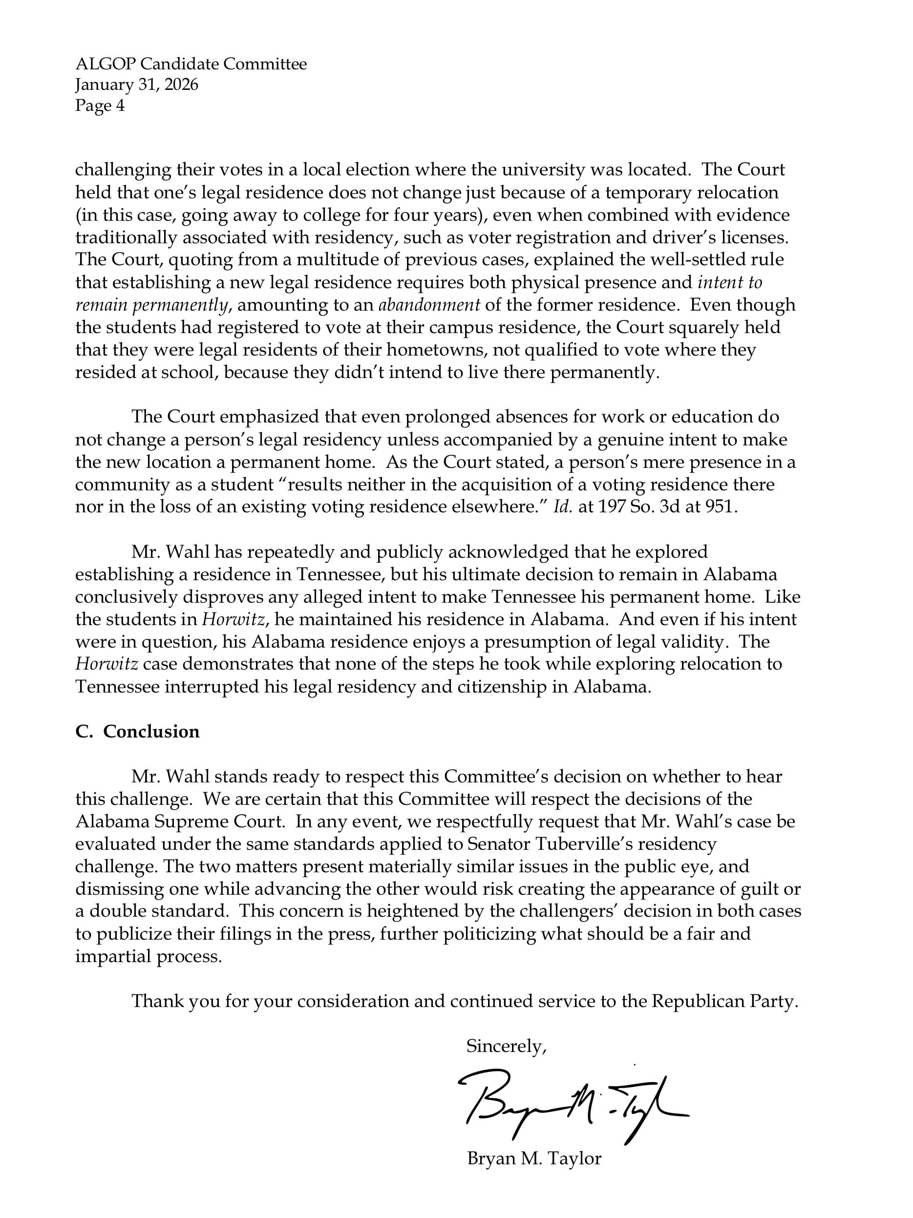 Taylor noted that Alabama law and long-standing legal precedents make clear that maintaining a second residence does not disqualify a candidate. He said the only relevant legal question was whether Wahl had maintained residency in Alabama. “The facts overwhelmingly proved that he had,” Taylor said. “John was born and raised in Alabama and has continuously voted, paid taxes, and maintained a residence here.”