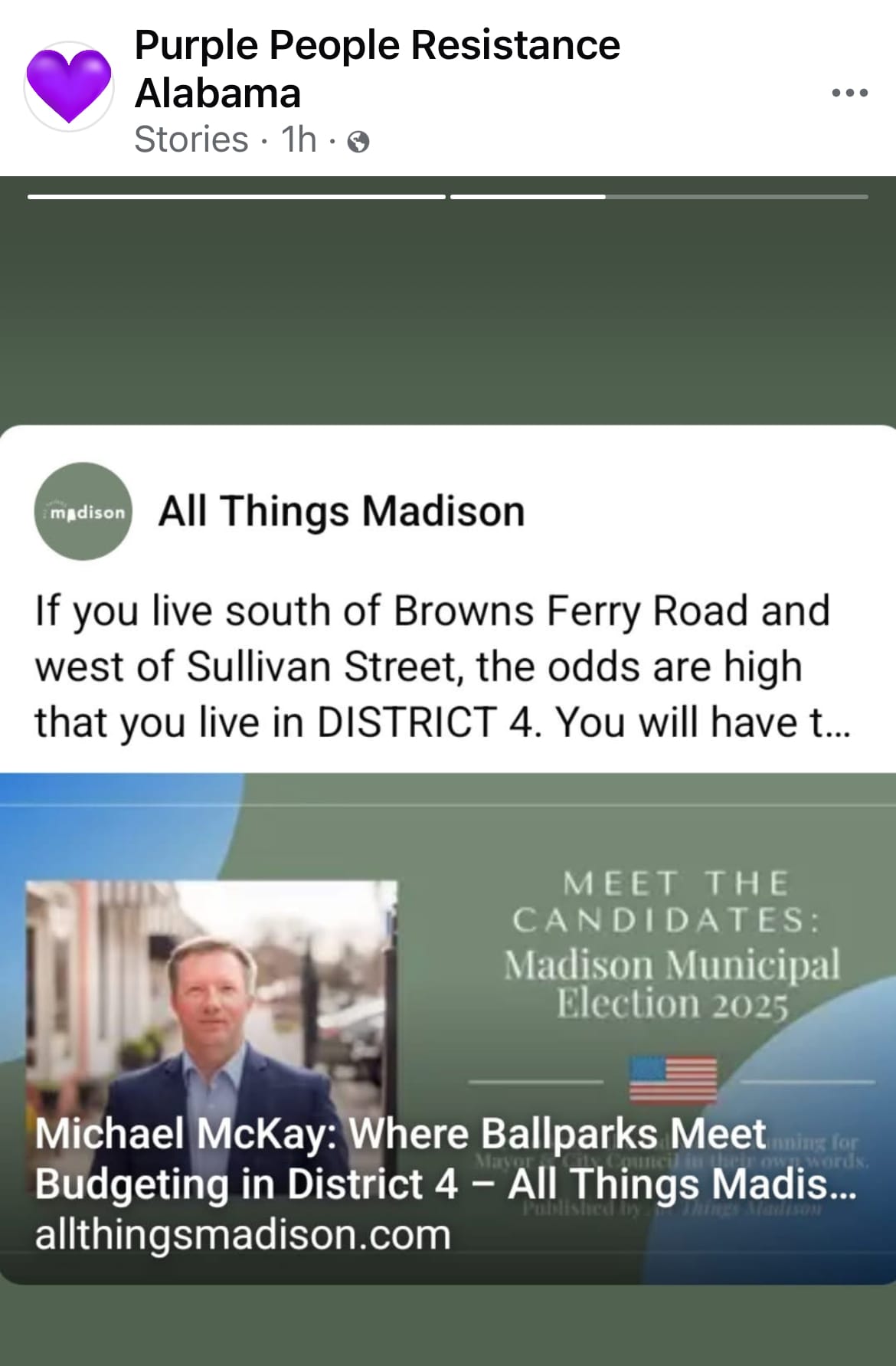 Homolak raised concerns about McKay’s links to Purple People Resistance, which has publicly promoted his campaign and holds ties to progressive organizations like Indivisible, 50501, and Read Freely Alabama. Despite presenting himself as a Republican, McKay has not denounced their support—a choice Homolak says may matter to conservative Madison voters.