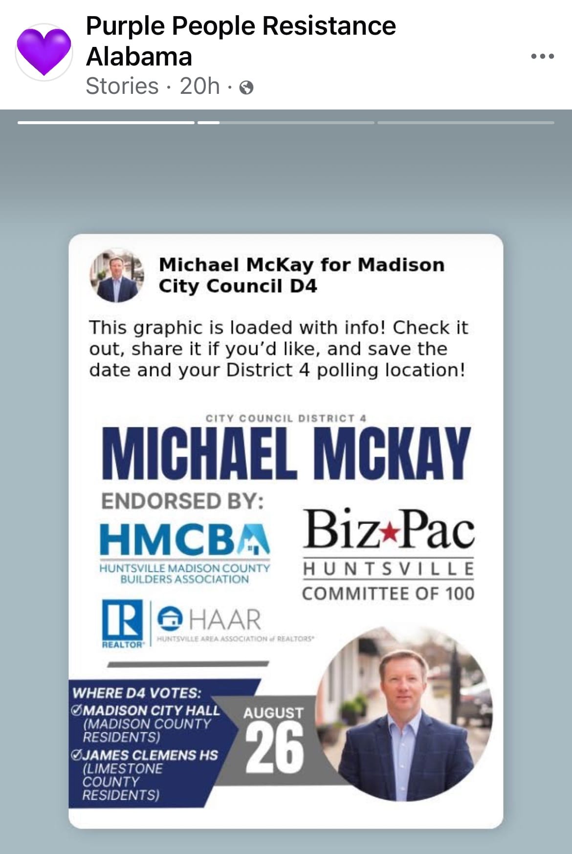As of this writing, ALPolitics.com can find no posts in support for McKay on the Purple People Resistance Alabama Facebook page. However, screenshots provided to ALPolitics.com (attached below) seem to support Homolak’s concerns, and suggest these posts may have been deleted.