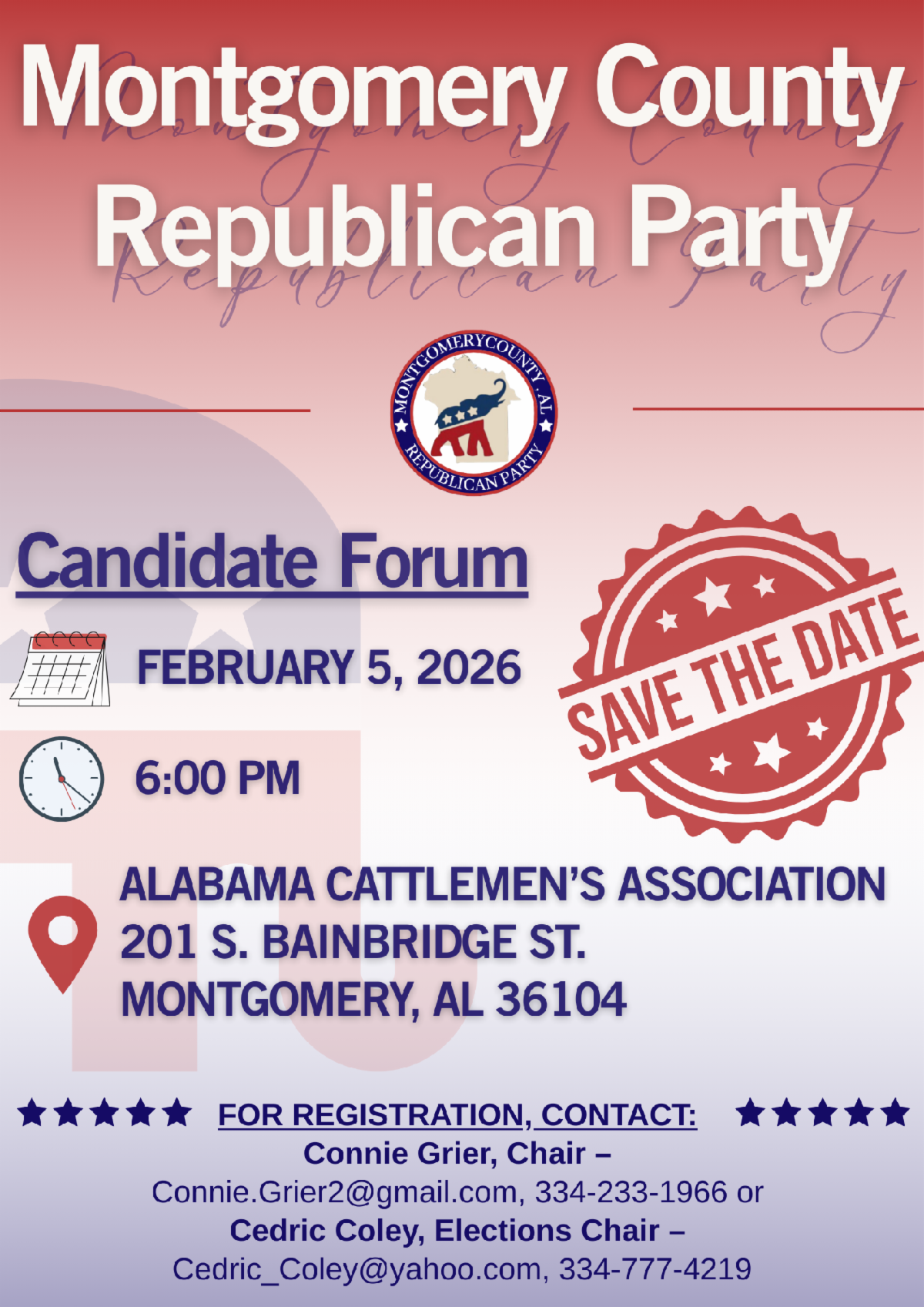 Over the coming weeks, ALGOP county parties and affiliated Republican organizations across the state will be hosting candidate forums, town halls, and meet-and-greet events. These gatherings give Republican voters the opportunity to listen, ask questions, and learn more about where candidates stand on the issues that matter most to Alabama families and communities.