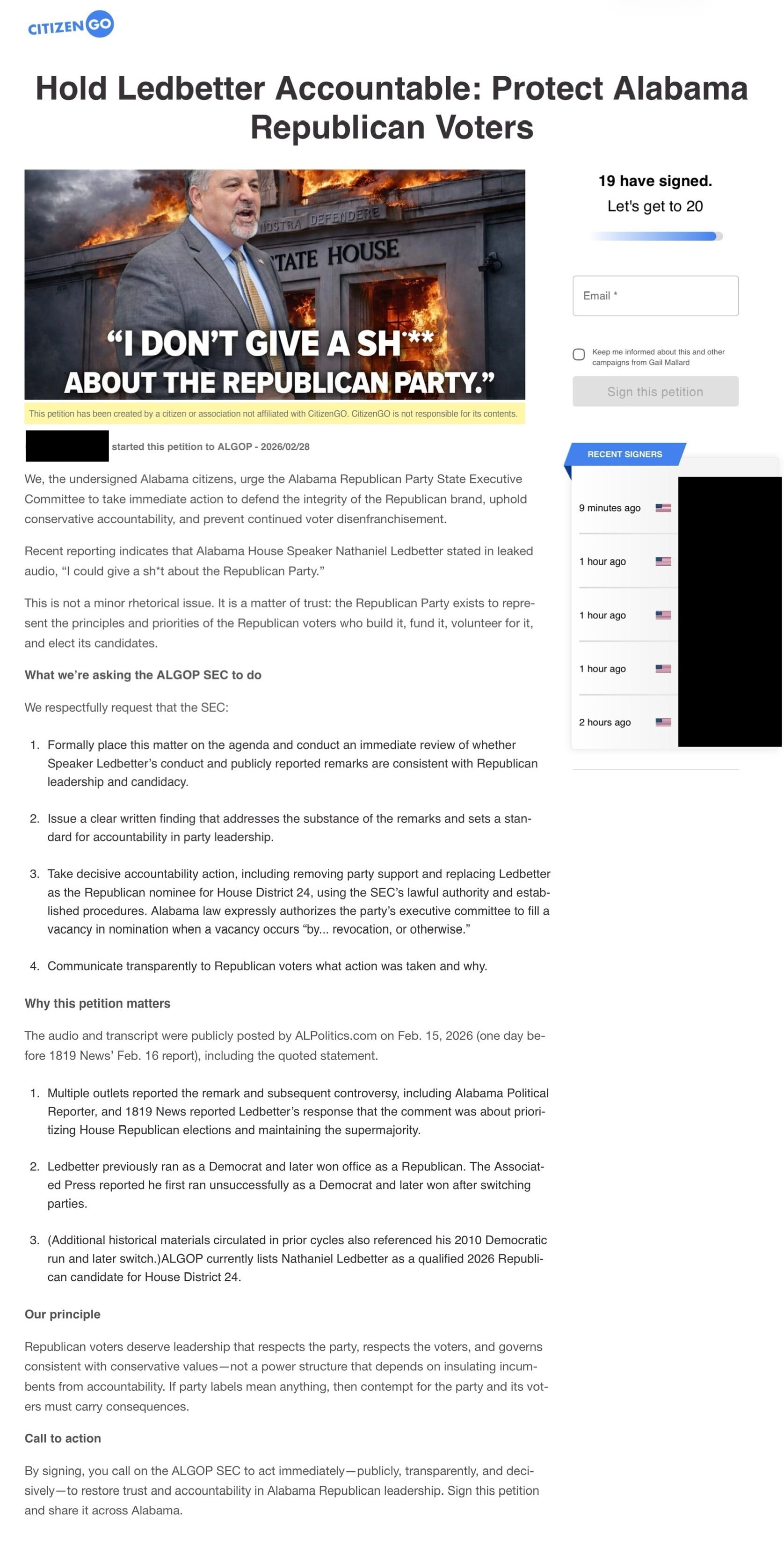Two citizen petitions were launched online Friday evening calling on the State Executive Committee (SEC) of the Alabama Republican Party (ALGOP) to address recent issues and ballot access concerns which have arisen with Speaker of the Alabama House Nathaniel Ledbetter and former ALGOP Chair John Wahl.