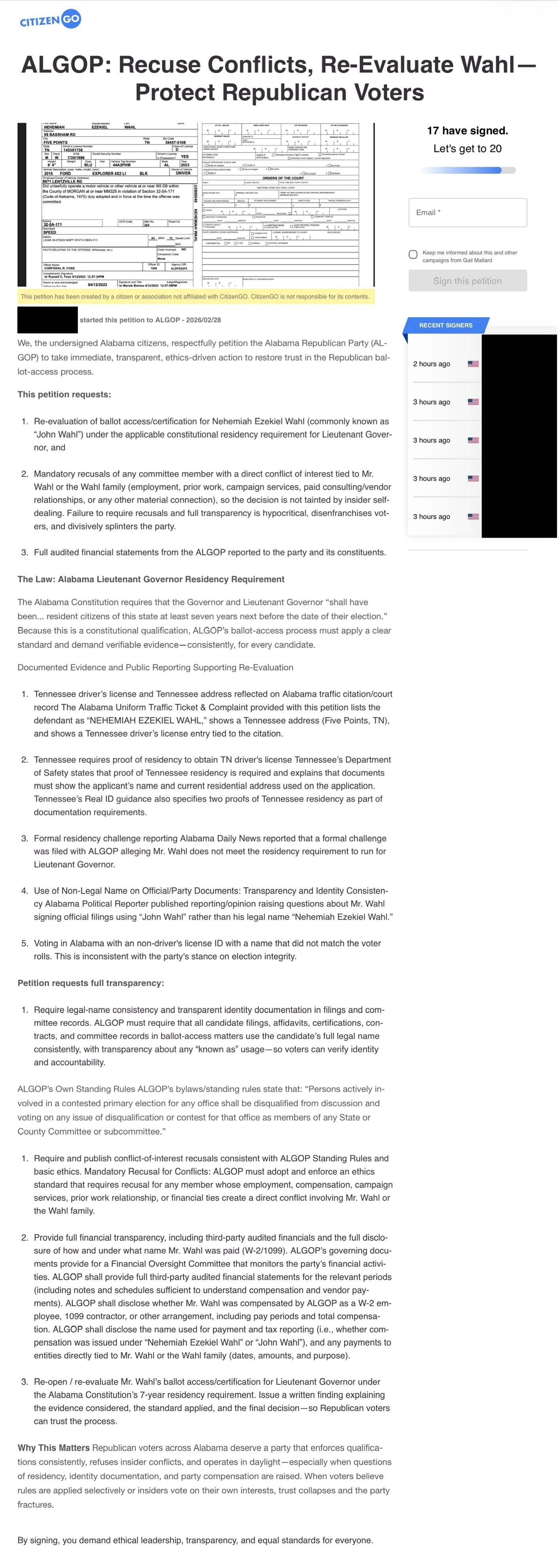 The Wahl petition calls upon ALGOP to “take immediate, transparent, ethics-driven action to restore trust in the Republican ballot-access process,” with requests for the: