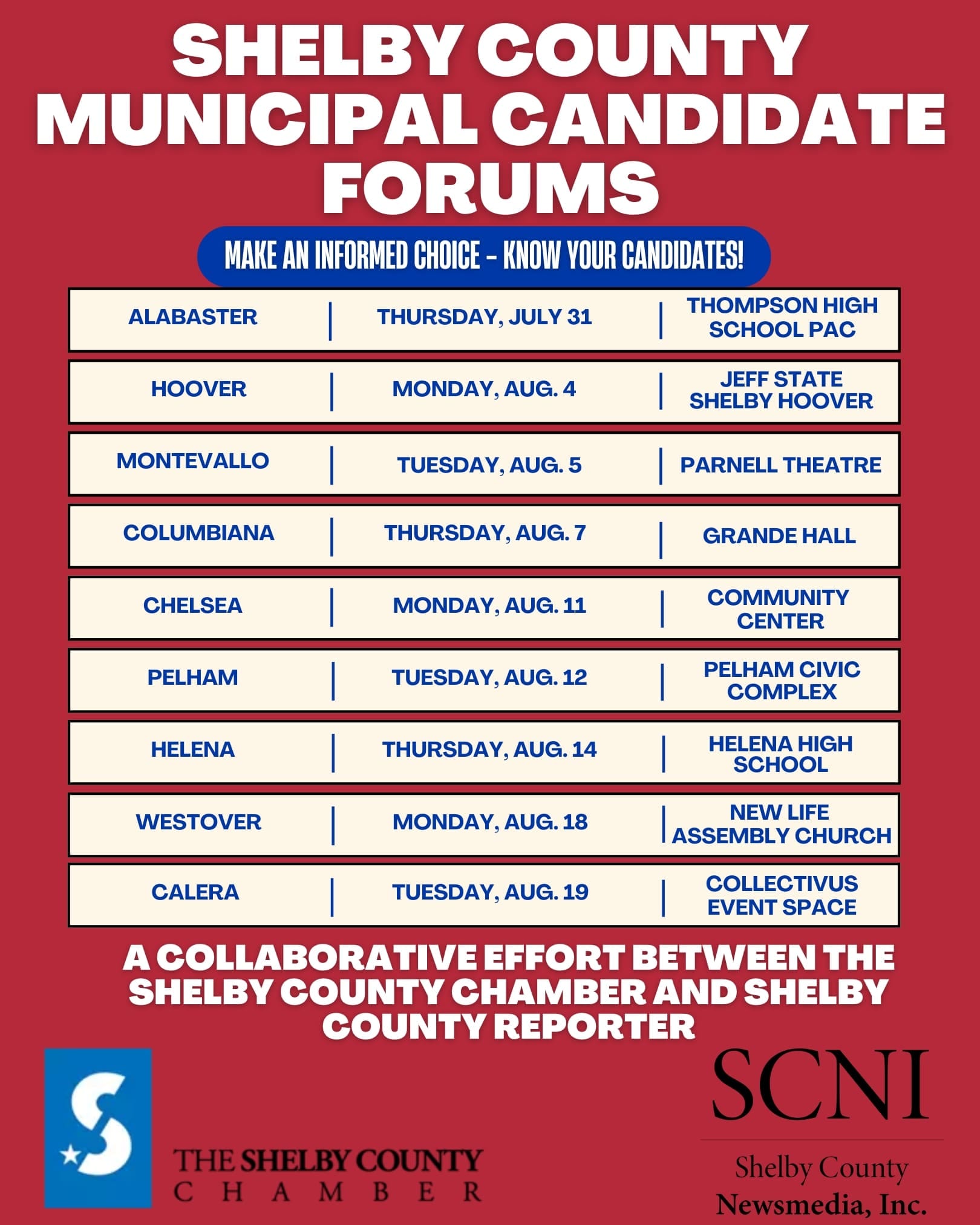 This will be the group’s last meeting before the August 26 municipal elections. The Shelby County Chamber of Commerce website has information on candidate forums to be held throughout the county, for voters to inform themselves on the candidates prior to the election. A graphic of these forums is below.
