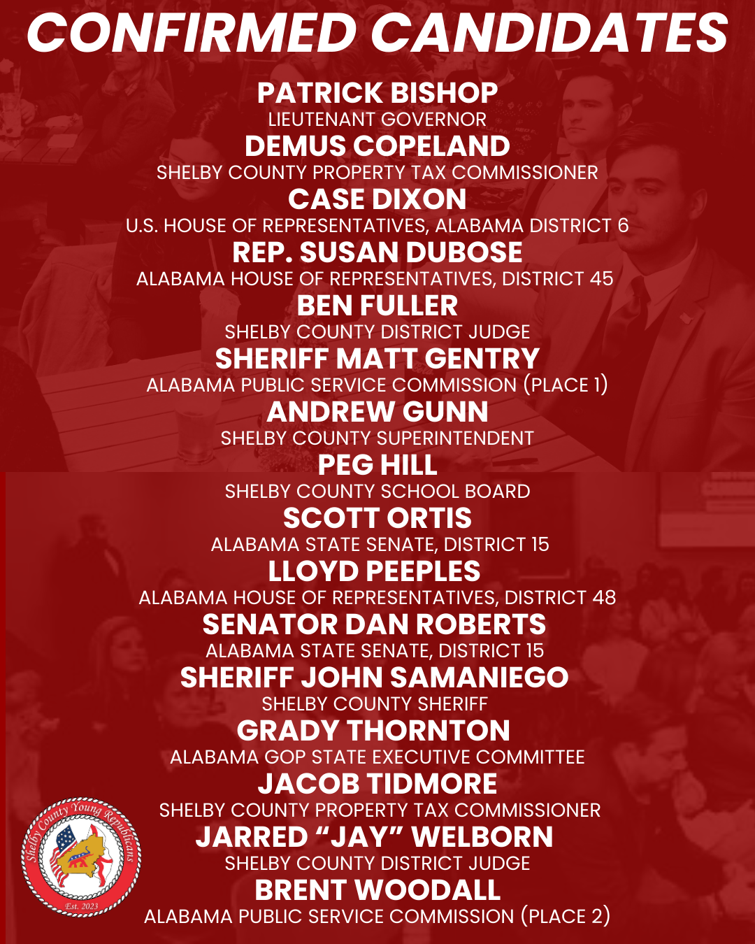 The Shelby County Young Republicans will be hosting a candidate mixer on Thursday evening, February 26 at Beef O’Brady‘s, 4300 Helena Rd., Helena, AL 35080.