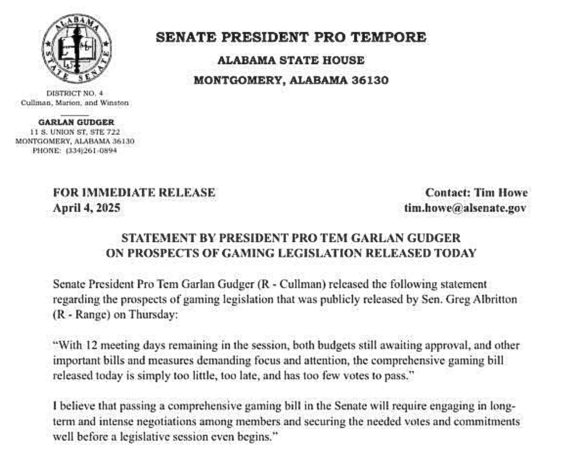 Albritton had been working on a comprehensive gambling bill to be introduced in the second half of the session. However, before this bill was introduced, State Senate President Pro-Tem Garlan Gudger released a statement last Thursday, April 4th saying any gambling bill was “simply too little, too late,” and had “too few votes to pass.”