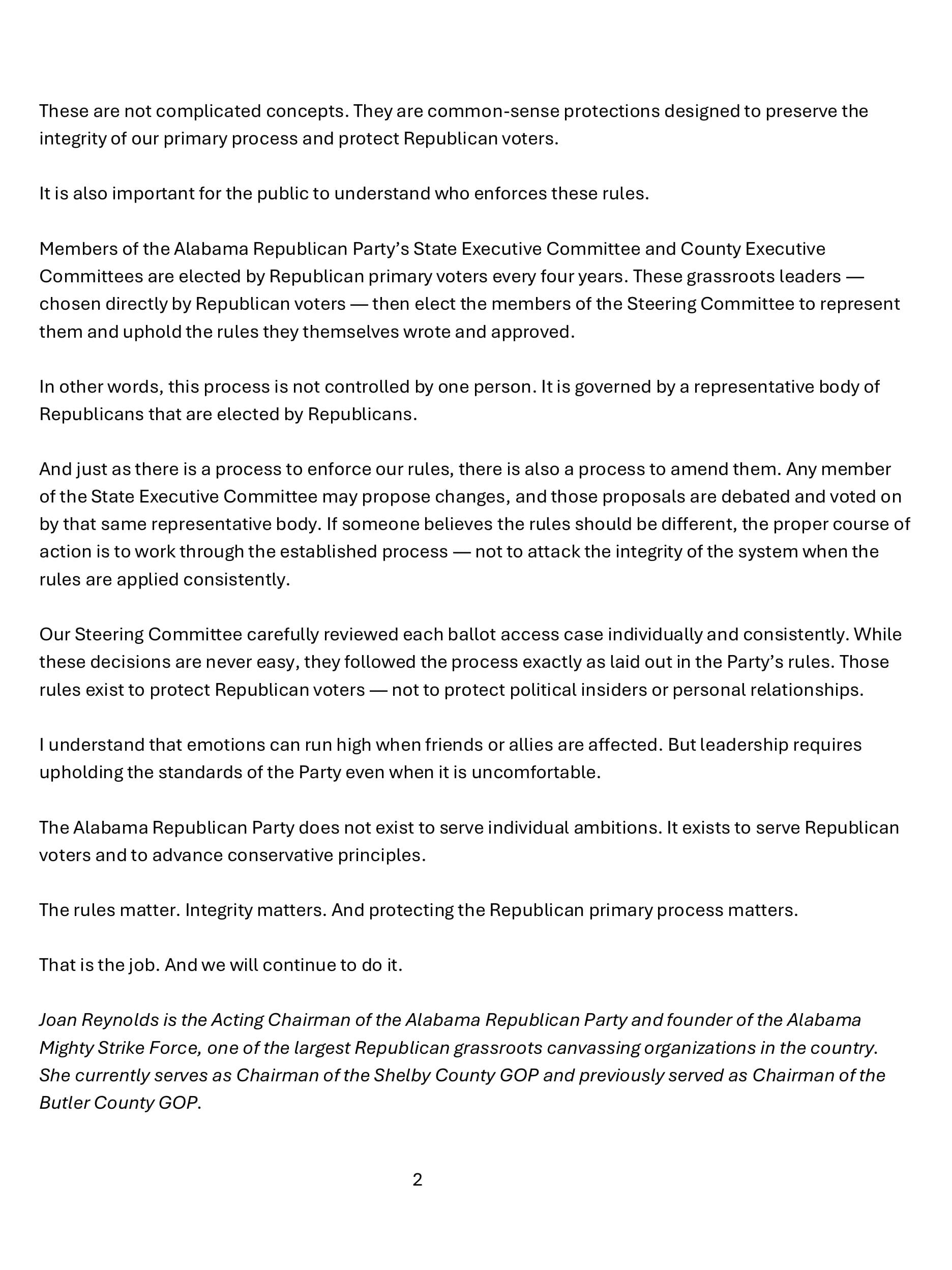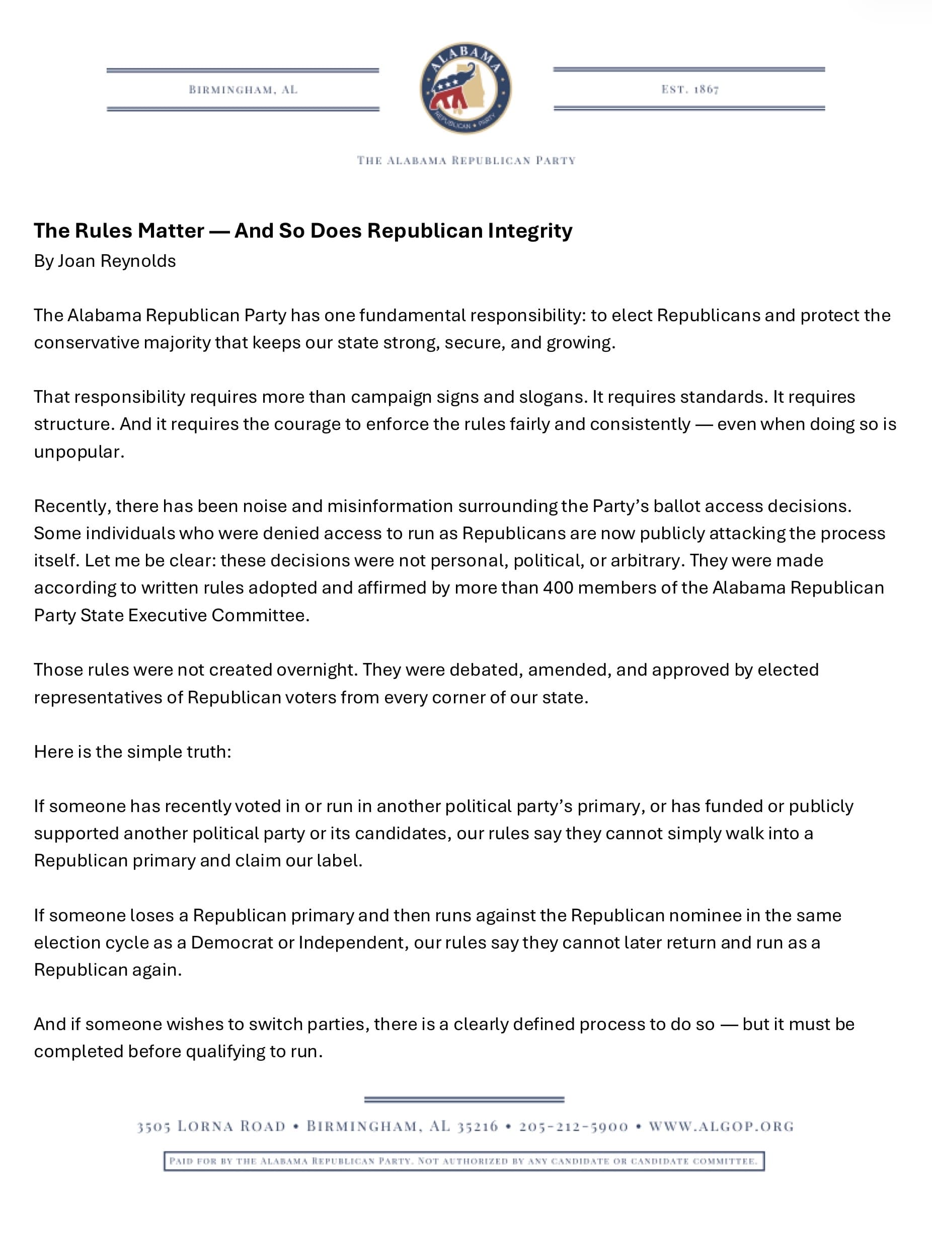 Recently, there has been noise and misinformation surrounding the Party’s ballot access decisions. Some individuals who were denied access to run as Republicans are now publicly attacking the process itself. Let me be clear: these decisions were not personal, political, or arbitrary. They were made according to written rules adopted and affirmed by more than 400 members of the Alabama Republican Party State Executive Committee.