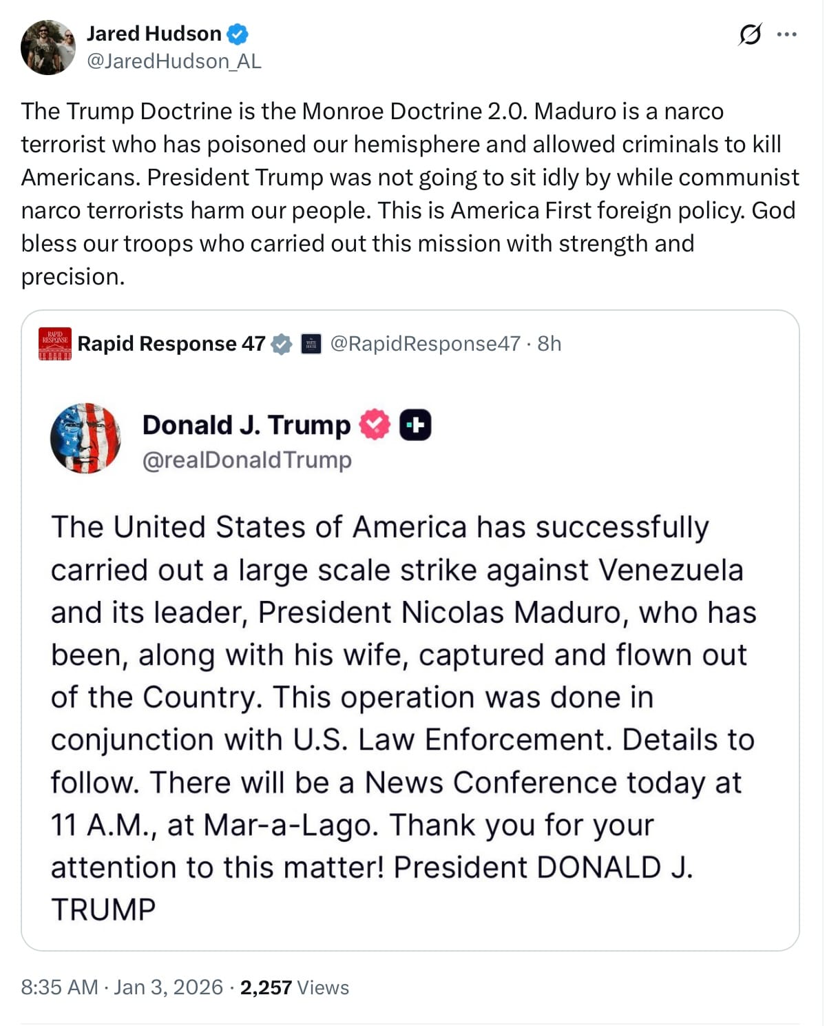 “The Trump Doctrine is the Monroe Doctrine 2.0. Maduro is a narco terrorist who has poisoned our hemisphere and allowed criminals to kill Americans. President Trump was not going to sit idly by while communist narco terrorists harm our people. This is America First foreign policy. God bless our troops who carried out this mission with strength and precision.”