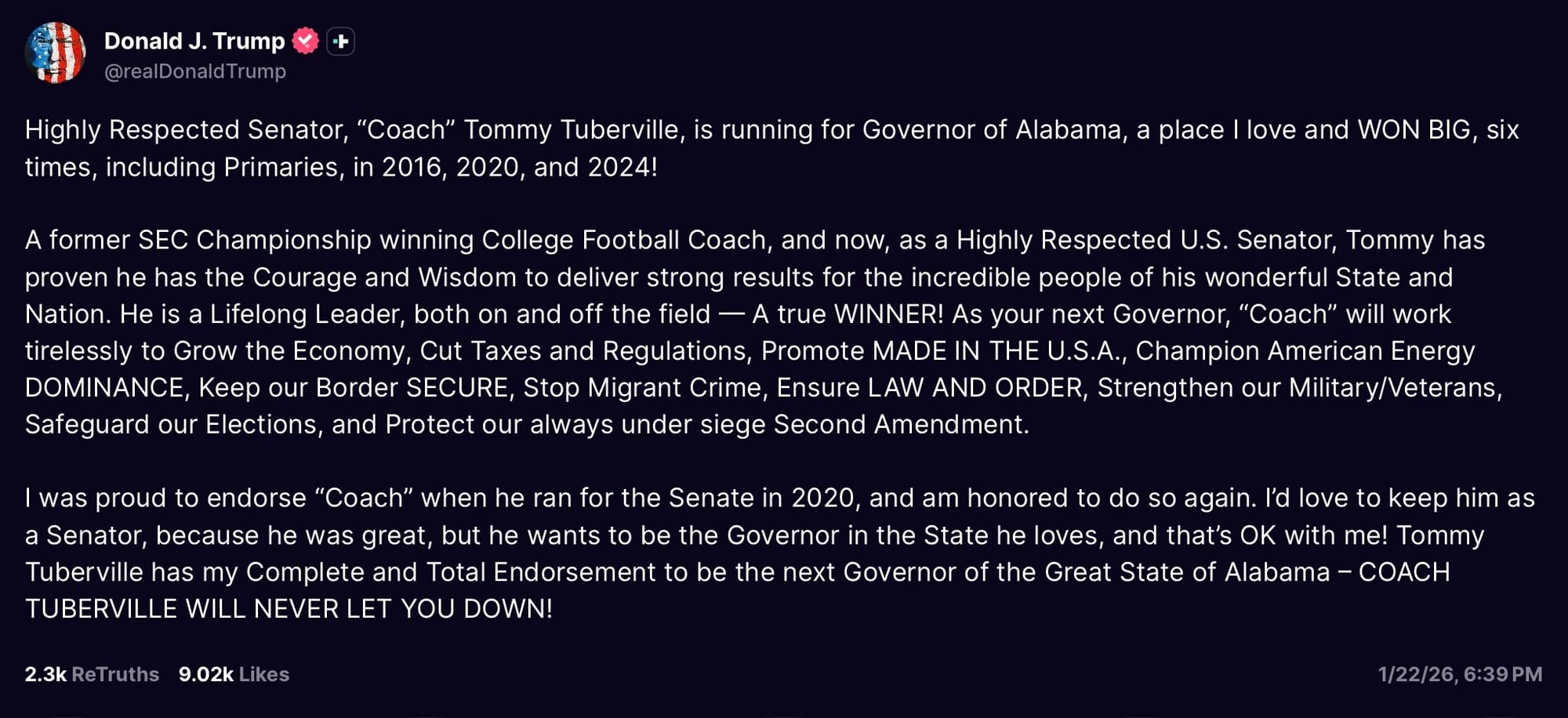 “Tommy Tuberville has my Complete and Total Endorsement to be the next Governor of the Great State of Alabama”—President Donald J. Trump