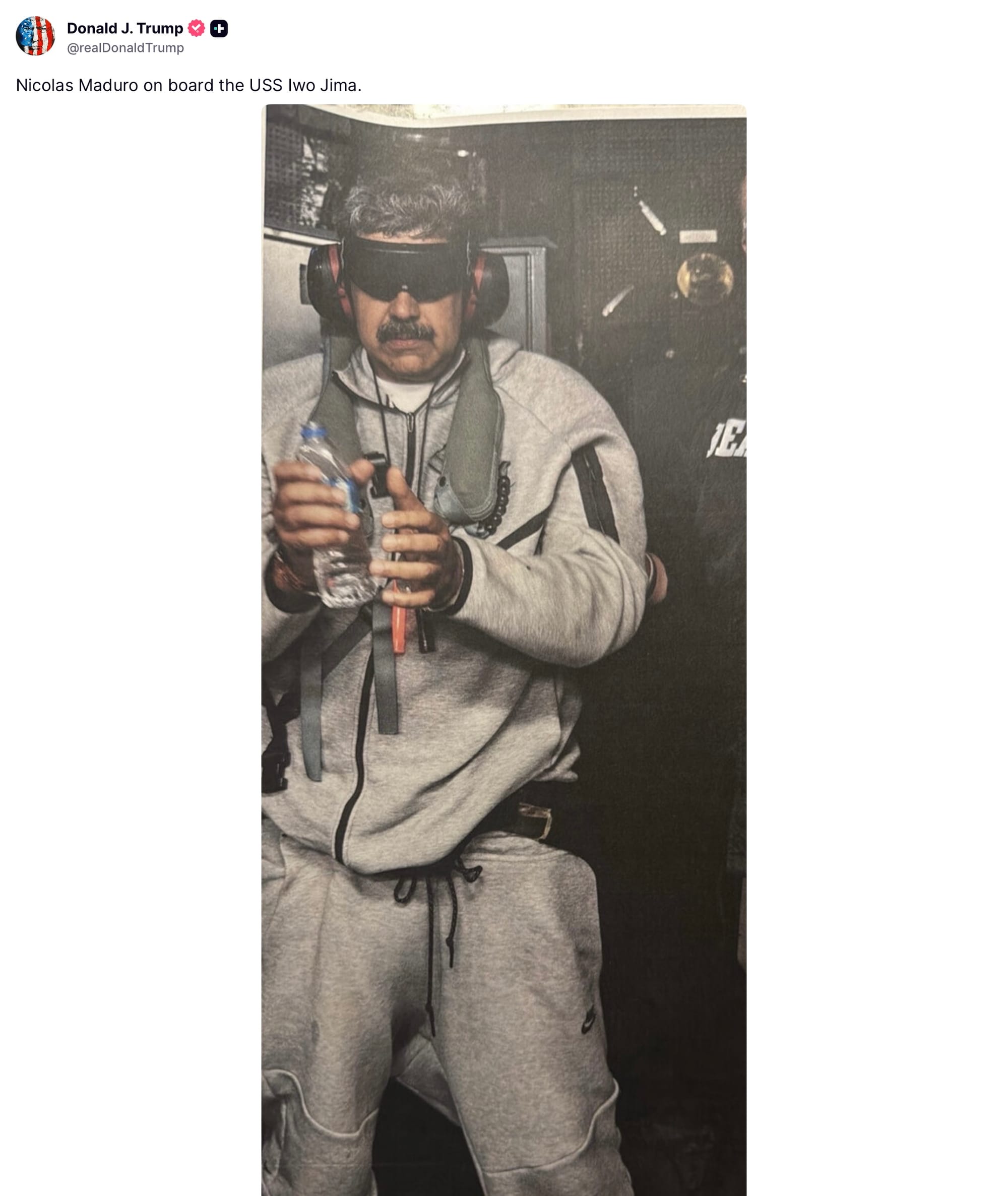 At 10:23 AM on 1/3/2026, the President posted this picture of Maduro on board the Iwo Jima on his Truth Social feed: