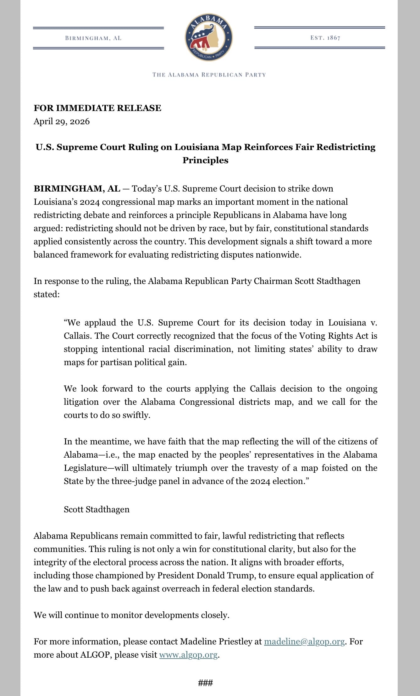 Alabama Republicans remain committed to fair, lawful redistricting that reflects communities. This ruling is not only a win for constitutional clarity, but also for the integrity of the electoral process across the nation. It aligns with broader efforts, including those championed by President Donald Trump, to ensure equal application of the law and to push back against overreach in federal election standards.